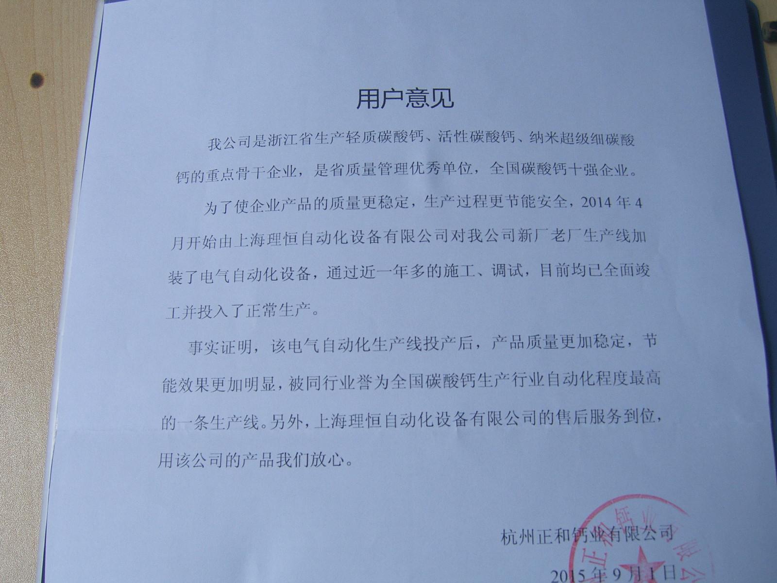 下圖為該碳酸鈣生產(chǎn)廠(chǎng)家出具的對(duì)我公司的設(shè)計(jì)、編程、施工及售后服務(wù)的高度評(píng)價(jià)的“用戶(hù)意見(jiàn)書(shū)”