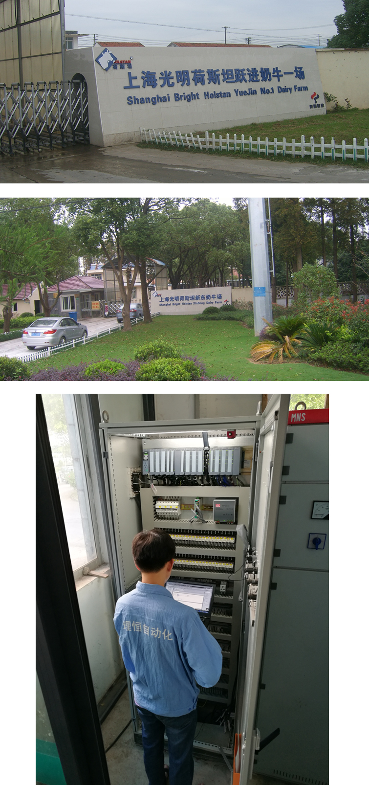 近日,我公司給位于上海崇明島的幾家奶牛養(yǎng)殖場的污水處理站配備了電氣自動化監(jiān)控裝置。上圖為光明荷斯坦躍進奶牛場,中圖為光明荷斯坦新東奶牛場,下圖為公司技術(shù)人員正在現(xiàn)場編程