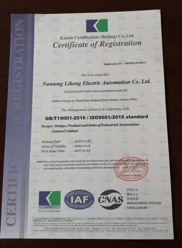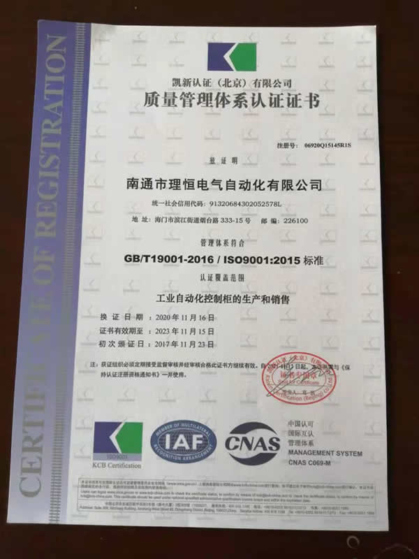 近日,我司工業(yè)自動化控制柜生產(chǎn)和銷售的全面質(zhì)量管理體系通過有關(guān)專家組織的現(xiàn)場考評驗收,公司管理體系符合GB/T19001-2016/ISO9001:2015標(biāo)準(zhǔn),換取新證。