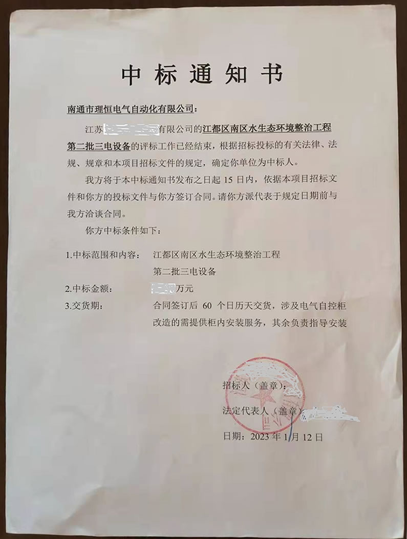 新春伊始,我司在江蘇某環(huán)保公司組織的“江都南區(qū)水生態(tài)環(huán)境整治工程第二批三電設(shè)備”的招標活動中獲得中標,從而揭開了新的一年的生產(chǎn)經(jīng)營序幕,實現(xiàn)開門紅。